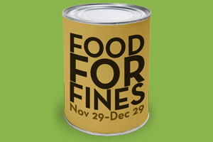 That’s right, Food for Fines is officially on for the next month. Have you got Media Services fines for Home Use Collection DVDs that were returned a bit late? Act now! This is the perfect opportunity to take care of your fines as you help others this holiday season.