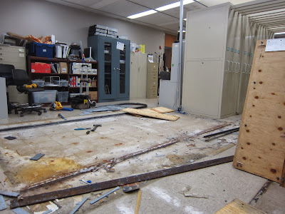 There is a time and a place for everything. Unfortunately, the bell has tolled for our old VHS shelves. As we continue to expand our DVD collection, we needed to install more practical and compact shelving, and our rolling VHS unit had to go. Our VHSes are still sticking around, but in the meantime, we had to clear everything off and, with the help of AU’s wonderful facilities team, demolish what was left.